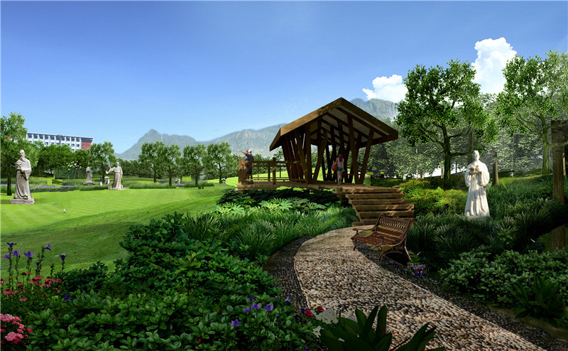 曲径通幽位于教学楼西侧的中心道路两侧的小花园,可适当建设木质画廊、铺设鹅卵石小径,草坪 中间缀以扁鹊、张仲景等中国古代医学名家雕像,设置形态各异的圆桌矮凳、小榻、奇石等。