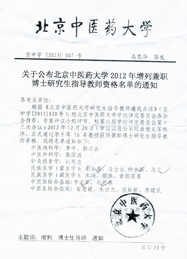 根据《北京中医药大学研究生指导教师遴选办法》(京中字[2011]030号),经北京中医药大学学位评定委员会各分会推荐、专家评议小组评审、校第六届学位评定委员会第十三次会议(2012年12月20日...