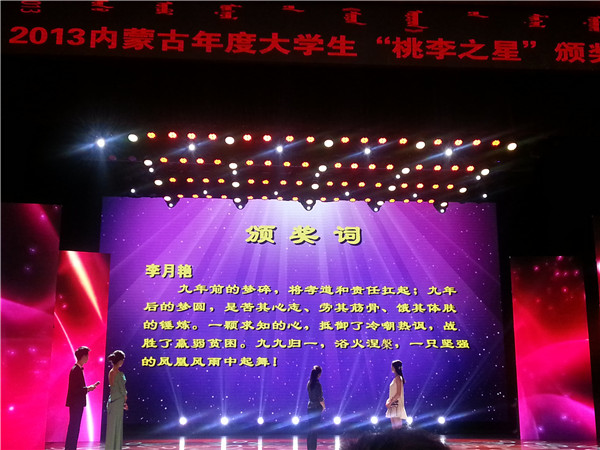 6月20日晚,2013内蒙古年度大学生“桃李之星”评选活动揭晓,颁奖晚会在内蒙古大学艺术学院演艺厅举行。