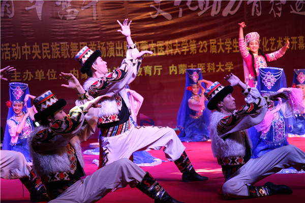 5月30日晚,2014年高雅艺术进校园中央民族歌舞团首场演出暨内蒙古医科大学第23届大学生科技文化艺术节在我校金山校区文体馆隆重举行。