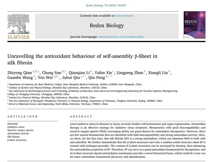 近日,我校基础医学院教师钱智勇博士与深圳湾实验室系统与物理生物学研究所、重庆大学生物工程学院、清华大学合作在国际著名学术期刊《Redox Biology》(中科院一区顶尖期刊,影响因子为:10.7) 发表了题为“Unravelling the antioxidant behaviour of self-assembly β-Sheet in silk fibroin”的研究论文,揭示了丝素蛋白(silk fibroin, SF)抗氧化作用机制。钱智勇博士为该论文的第一作者(内蒙古医科大学为第一作者单位)。
