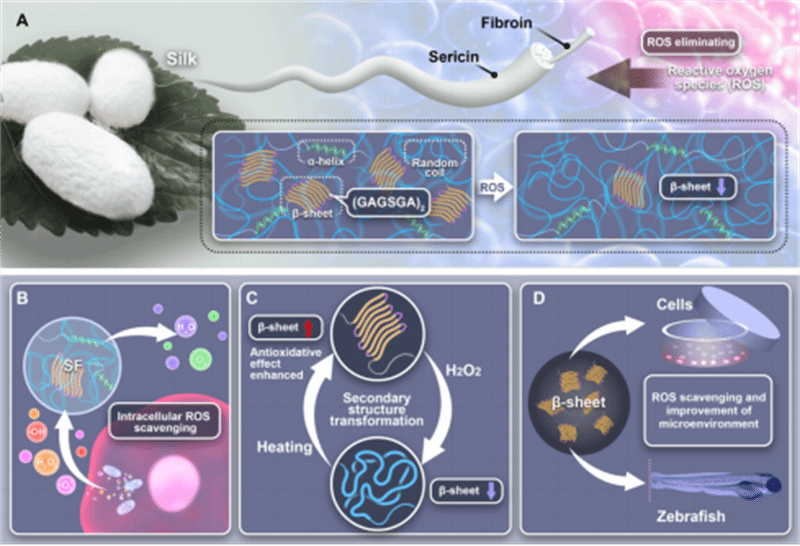 该研究团队发现丝素蛋白(silk fibroin,SF)是具有强抗氧化功能的天然生物材料,它可以清除小鼠胚胎成纤维细胞(NIH3T3细胞)和斑马鱼损伤部位过量的活性氧(文章示意图1B和D所示)。为了揭示SF抗氧化作用机制,研究团队选择了SF最具代表性的重复序列区域的十二肽GAGSGAGAGSGA来探索其抗氧化机制。经过胞内活性氧荧光探针染色、质谱、荧光光谱、圆二色光谱、衰减全反射傅里叶变换光谱等仪器分析发现,GAGSGAGAGSGA自组装成β-sheet具有清除ROS功能,被氧化后β-sheet变成Random coil结构(图1A所示)。为了增强丝素的抗氧化功能,研究团队通过加热的方式增加了SF中β-sheet结构,高温处理后的丝素抗氧化能力增强,被过氧化氢氧化后变成Random coil结构(图1C所示)。SF可以作为一种良好的抗氧化生物材料,用于降低损伤组织中氧化应激反应,加速损伤组织修复。β-sheet结构抗氧化机制的研究为新抗氧化剂开发提供了新的理论基础和新线索,为抗氧化来保护细胞将促进活性氧相关疾病的临床治疗提供新治疗思路。