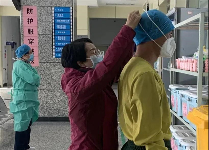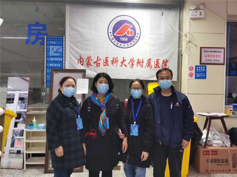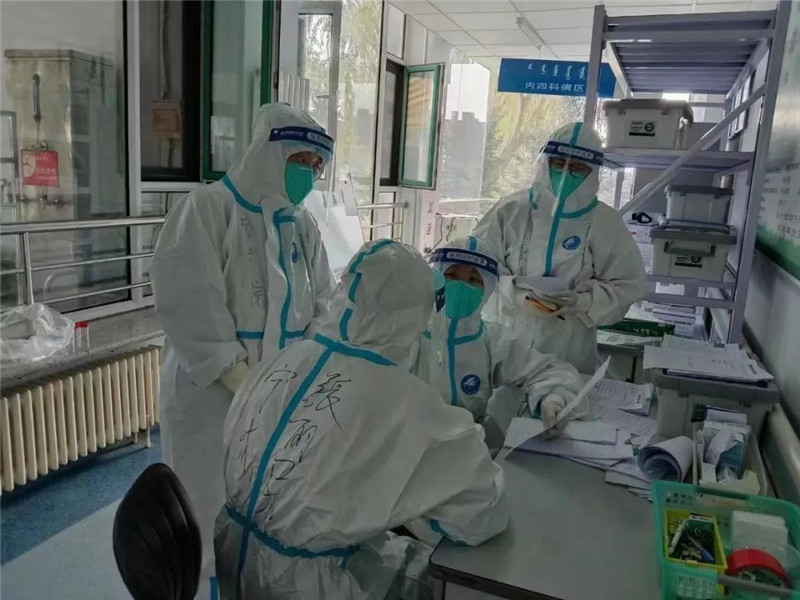 战疫一线的情况牵动着全院上下的心。医疗队中,感控、管理、后勤保障人员也在密切配合着救治工作。医疗队成立了党务工作组、医疗组、护理组、医技组、院感组、消杀组、后勤保障组,大家各司其职、各尽其能。曾担任内蒙古第八批援鄂医疗队队长和总联络员的副院长侯明星和护理部总护士长张凤云,有着丰富的抗疫和管理经验,毅然承担起医疗队“大家长”的职责;疾病预防控制部部长孟庆兰任自治区新冠肺炎防控指挥部感控组副组长,与感控专家们时刻关注着一线人员的安全,全力保障医疗队伍“零感染”;呼吸与危重症医学科主任医师张卿作为自治区专家组成员,与主任医师徐磊、吕秀云共同配合,负责整个病区的医疗事务;护士长郭艳梅与百余人的护理团队团结一心,日夜守护在患者身边;后勤组负责医疗队的生活保障,在背后默默付出,做医疗队强大的后盾。医院每日召开例会总结汇报定点医院各项工作,从院领导到各职能科室负责人,都密切关注着前方的信息,统筹管理、解决问题。医院领导多次带队前往内蒙古第四医院,了解医疗队工作情况,看望慰问医疗队员,统筹协调各项事务。