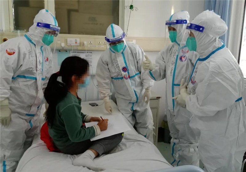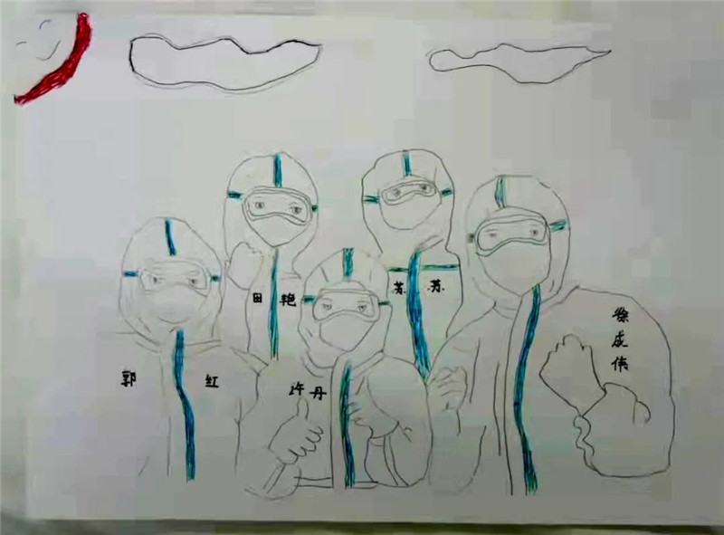 在普通病区,尽管患者病情较轻,但人数多,个体差异大,除了精湛的医疗技术,更需要耐心、细心和暖心。医务人员要兼顾治病救和日常护理,还要密切关注患者情绪。有特殊情况的患者更需要医护人员的悉心照料。十几天时间里,他们用精湛的专业技术和严谨的工作态度得到了国家和自治区专家组、感控组及管理人员的肯定,更得到患者的信赖与支持。病区内有一位小患者,用画笔画下了医护人员穿防护服的样子,向医护人员致谢。