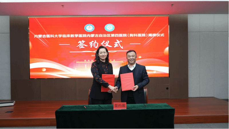 薛明明副校长与郑兰兵院长签订《内蒙古医科大学临床教学医院合作协议书》。