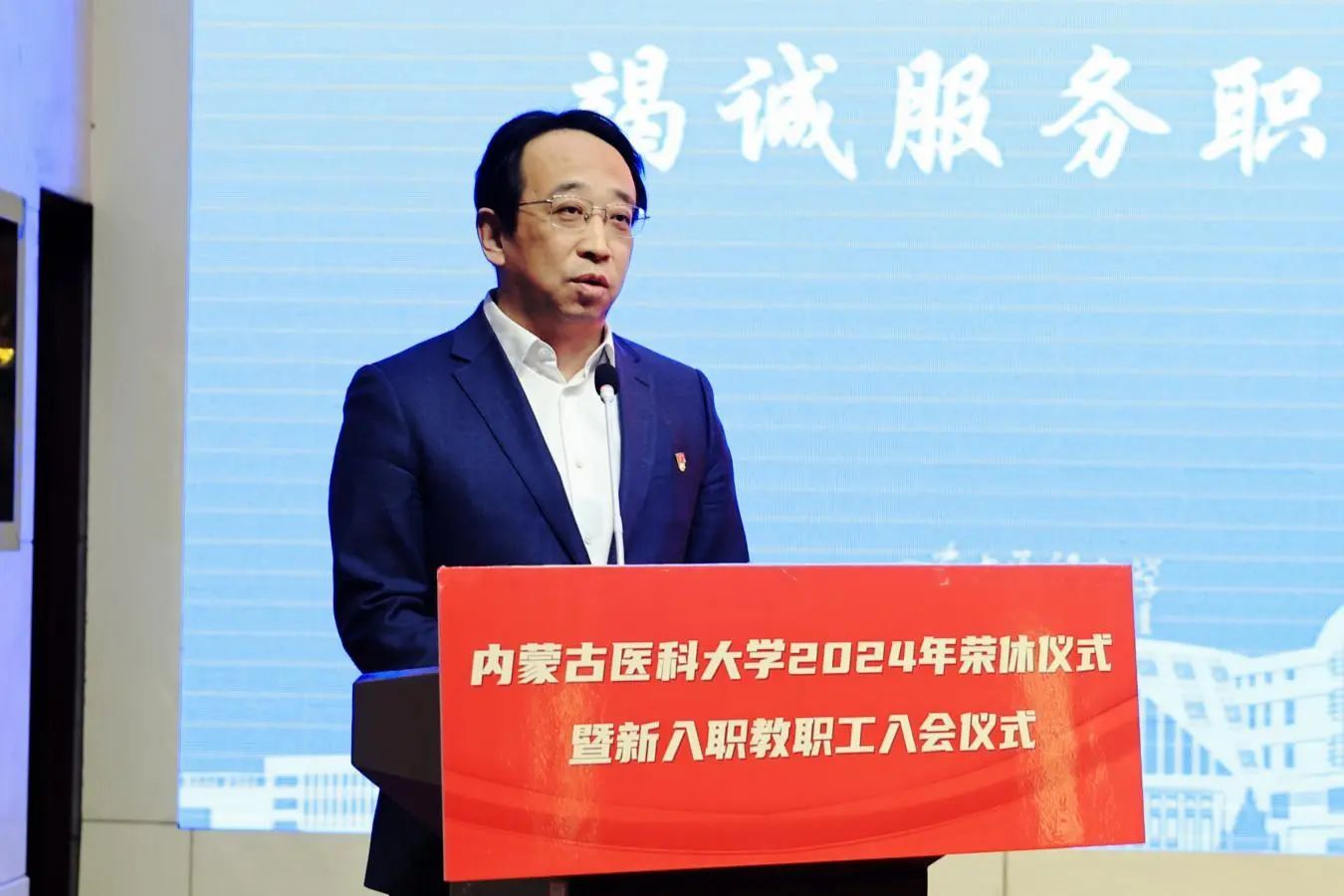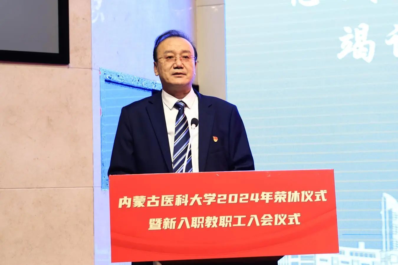 学校党委书记赵云山讲话。他代表学校,向全体荣休教职工致以崇高的敬意,向新入职教职工表示诚挚的欢迎,并向为学校建设发展辛勤奉献的全体教职工表示衷心的感谢。并对广大教职工提出三点期望:一是要胸怀感恩之心。广大教职工要始终牢记、倍加珍惜退休教职工的历史功绩,秉承老一辈内医大人优良传统,以积极进取的心态、饱满的工作热情投入到教书育人、悬壶济世的伟大事业中。二是要坚定奋进之志。希望新入职教职工尽快转变角色,熟悉工作岗位,以荣休教职工和资深前辈为榜样,怀揣以内医大为家、以内医大为荣的真挚情怀,潜精研思、勇攀高峰。三是要彰显实干之为。广大教职工和医务工作者,是学校教师队伍中的生力军,要将教育家精神内化为自觉追求,敬畏职业尊严,做以德立身、以德立学、以德施教、以德育德的楷模。奋力开创具有区域特色一流医科大学建设新局面。