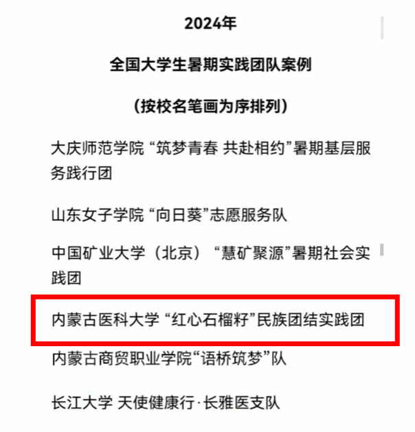 内蒙古医科大学“红心石榴籽”民族团结实践团队实践地点位于内蒙古自治区包头市达尔罕茂明安联合旗百灵庙镇。该团队在活动中通过参观考察、调研走访、学习交流、志愿支教等方式,使实践团成员迈进基层、走进乡村,以青年力行、用青听青说、践青春担当,将民族团结“有形”呈现、“有感”宣传、“有效”推广,在实践活动中不断铸牢中华民族共同体意识。