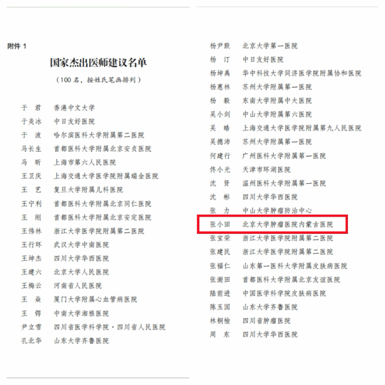 此次评选经过了严格的选拔程序,包括各省市区初选部门推荐、网络函评、会议评审等多个环节,确定了100名国家杰出医师、200名国家优秀青年医师人选。我校附属肿瘤医院(北京大学肿瘤医院内蒙古医院)张小田教授入选国家杰出医师人选。