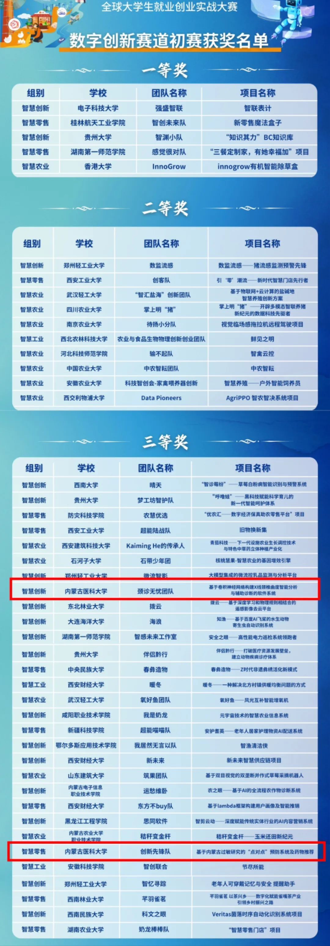 在刚刚落幕的2024年“正大杯”全球大学生就业创业实战大赛中,我校“颈诊无忧”团队的“基于卷积神经网络构建 X 线颈椎曲度智能分析与辅助诊断的软件系统”项目和“创新先锋队”的“基于内蒙古过敏研究的‘点对点’预防系统及药物推荐”项目,荣获“数字创新赛道”初赛三等奖;“独角售”团队的“订阅制配送”项目获得“实战营销”赛道内蒙古赛区三等奖;我校团委获得“优秀组织奖”。