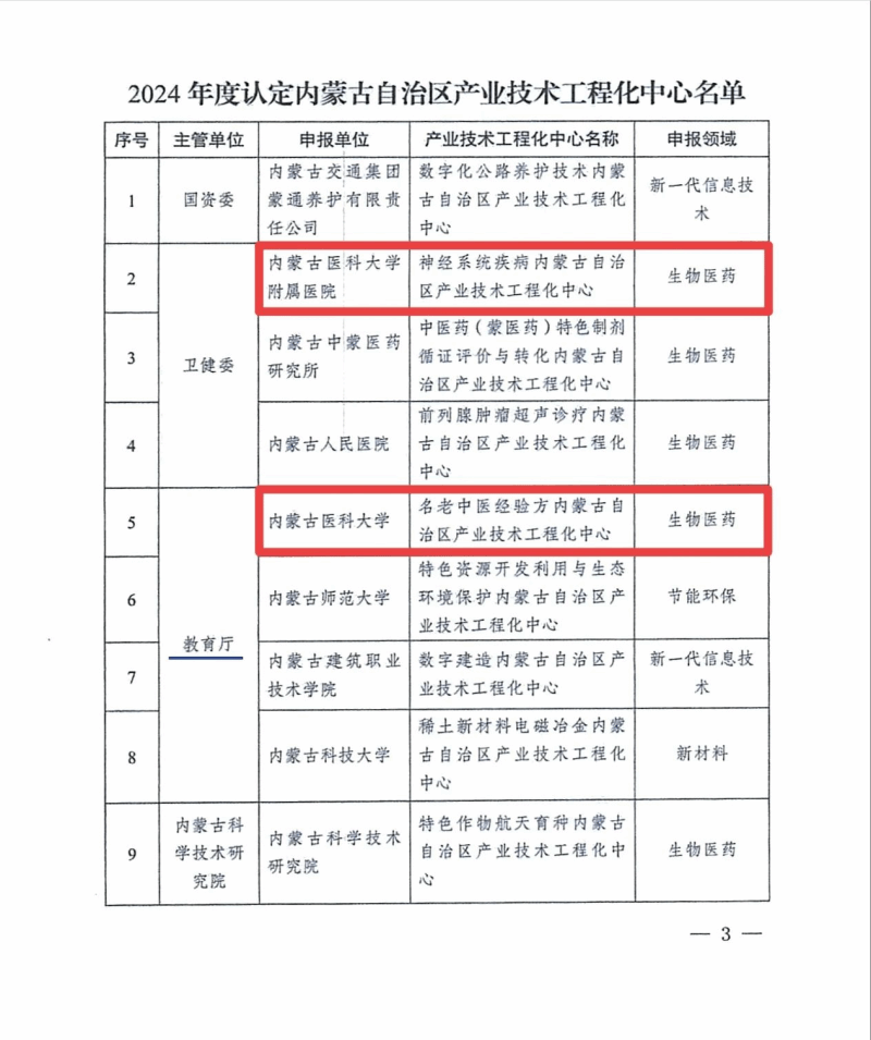 近日,内蒙古自治区发展和改革委员会公布了2024年度内蒙古自治区产业技术工程化中心认定名单,我校中医学院“名老中医经验方内蒙古自治区产业技术工程化中心”和附属医院“神经系统疾病内蒙古自治区产业技术工程化中心”成功入选。