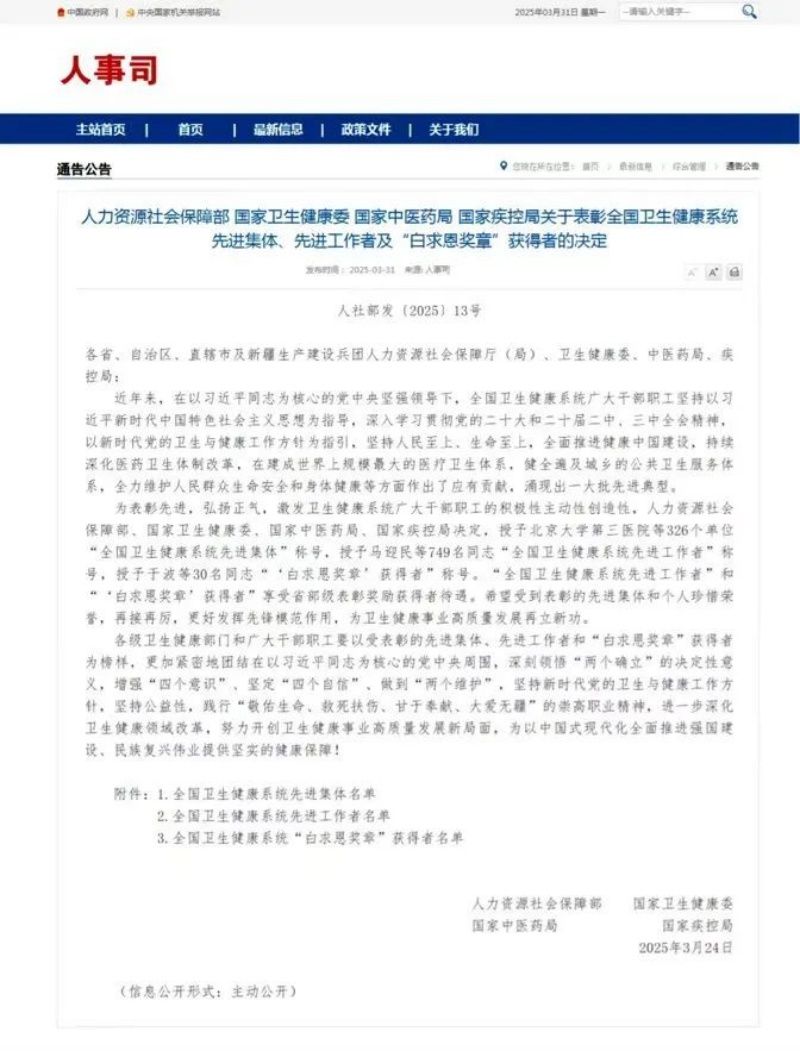 近日,人力资源社会保障部、国家卫生健康委、国家中医药局、国家疾控局公布了《关于表彰全国卫生健康系统先进集体、先进工作者及“白求恩奖章”获得者的决定》。我校第二附属医院和附属肿瘤医院荣获“全国卫生健康系统先进集体”称号,附属医院核医学科王雪梅教授荣获“全国卫生健康系统先进工作者”称号。