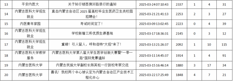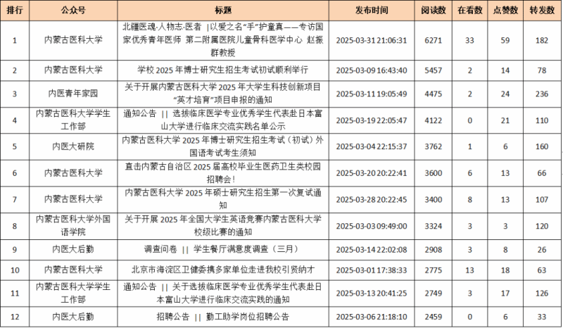 在融媒体蓬勃发展的新时代浪潮中,学校的每一个微信公众号,都是传播正能量的重要阵地。依托微信公众平台强大的传播力,我们得以触达更为广泛的受众群体,传递兼具深度与温度的优质内容。微信公众号影响力排行榜,依据精准的数据分析,各平台得以相互借鉴、博采众长,精准找出自身短板,汲取他人成功经验,在交流互鉴中共同提升内容质量。让我们携手并肩、砥砺前行,用生动笔触和创新视角,讲好内医大的精彩故事,以有力之声和多元渠道,唱响内医大的动人旋律,持续提升内医大的社会影响力与美誉度。