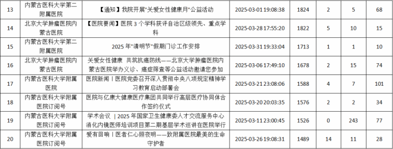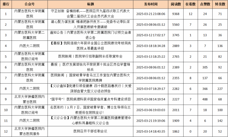 【内蒙古医科大学附属医院】以WCI指数501.98、文章总数15、阅读总数31824、点赞总数593的卓越表现,位列3月影响力榜首!