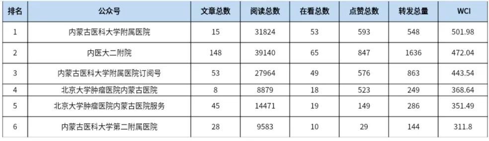 【内蒙古医科大学附属医院订阅号】以WCI指数443.54、文章总数53、阅读总数27964、点赞总数576的稳定发挥,位居第三。