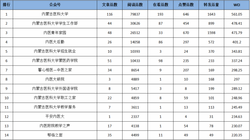 【内蒙古医科大学】以WCI指数561.05、发文总数116、阅读总数79837、点赞总数646的优异成绩位居排行榜首位!这一成绩的取得,是学校各方面工作成果的体现,也是学校广大师生和社会各界关注与支持的结果。