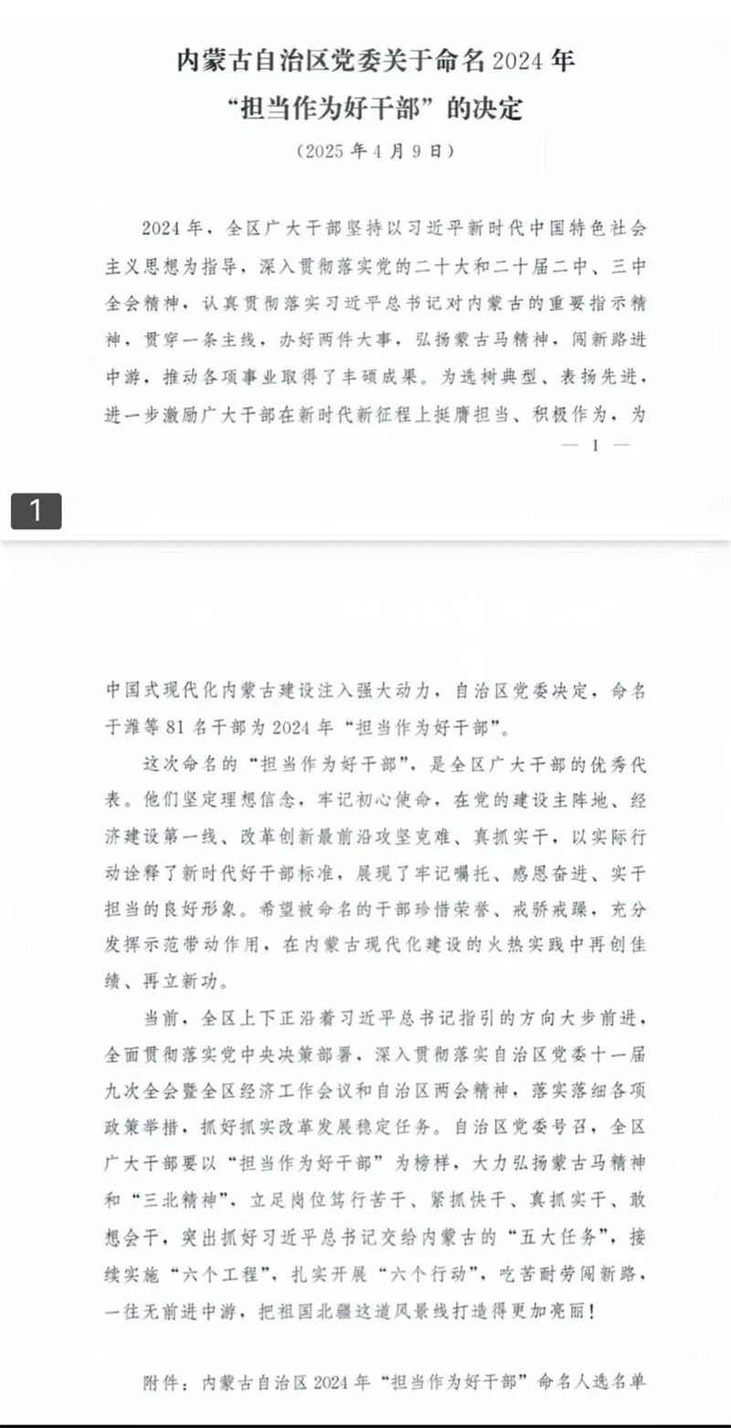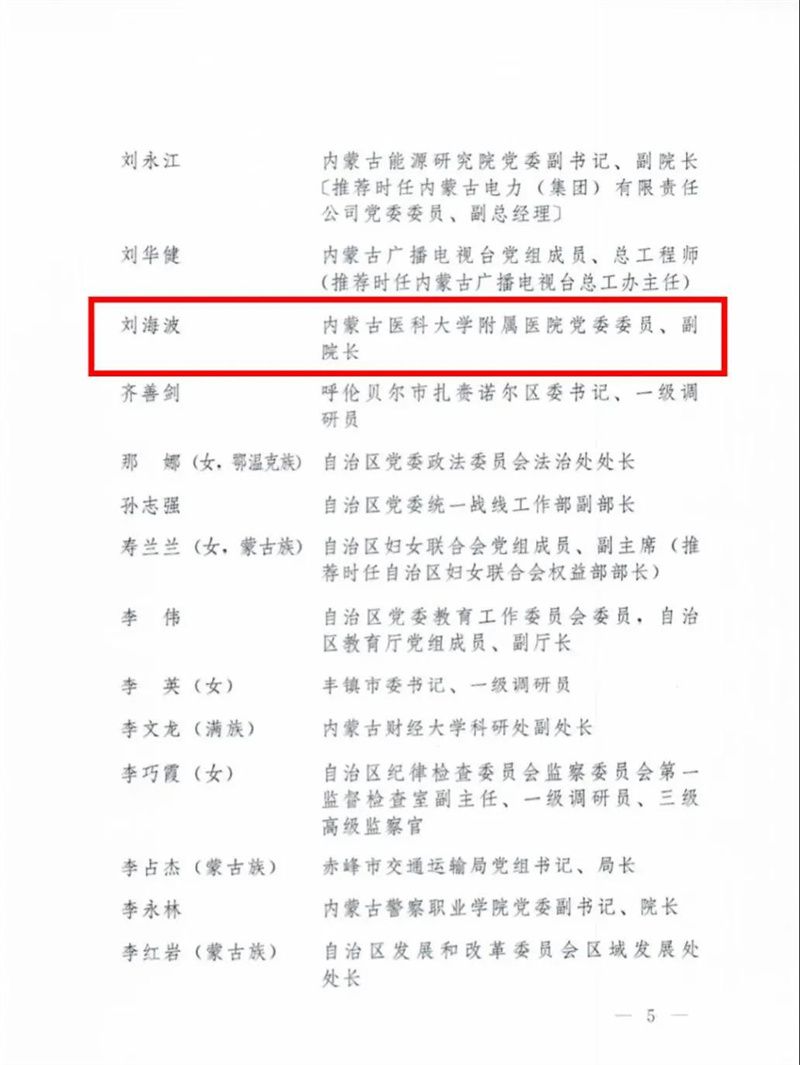 近日,内蒙古自治区党委公布了《内蒙古自治区党委关于命名2024年“担当作为好干部”的决定》,我校附属医院刘海波同志被命名为2024年“担当作为好干部”。