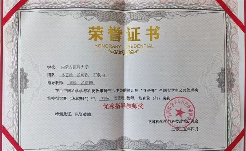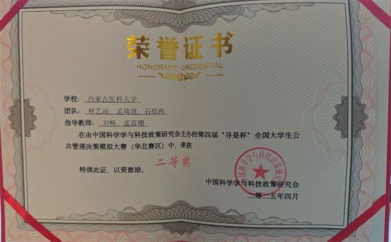 4月25日至27日,由中国科学学与科技政策研究会主办,中国科学学与科技政策研究会公共管理专业委员会协办,北京对外经济贸易大学承办的第四届“寻是杯”全国大学生公共管理决策模拟大赛(华北赛区)成功举行,来自华北地区的46所高校代表队参与角逐。我校由卫生管理学院青年教师刘畅和孟蓝珊担任指导老师,2022级劳动与社会保障专业林艺函、2023级医疗保险专业孟琦淏和公共事业管理专业石欣冉同学组成的代表队获得大赛二等奖。
