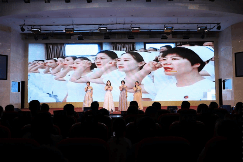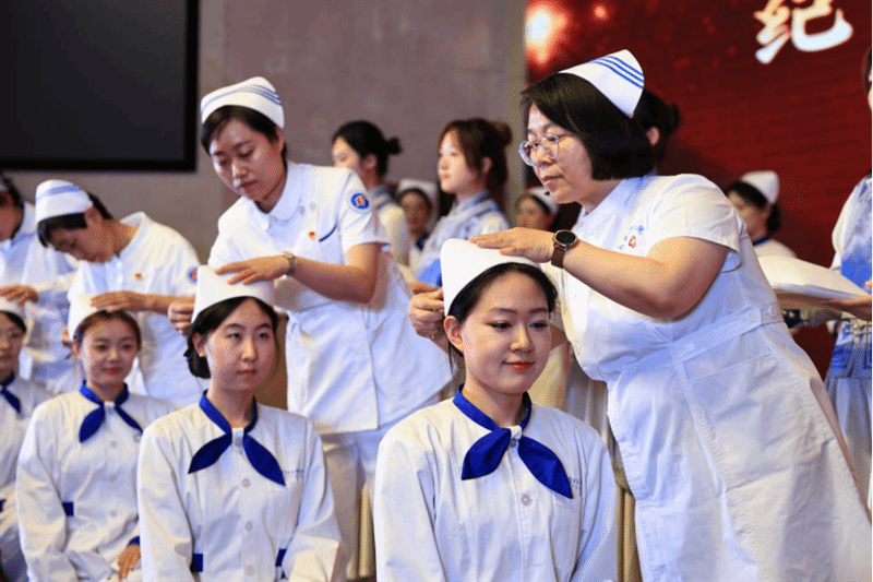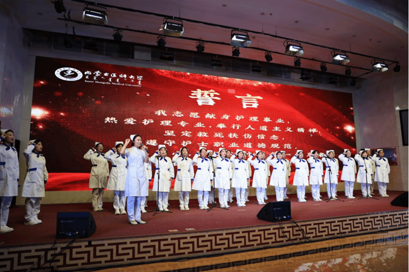 在授帽仪式环节,第五临床医学院(呼和浩特市第一医院)护理部主任李义、第二附属医院护理部副主任李莉、附属肿瘤医院(北京大学肿瘤医院内蒙古医院)护理部副主任柏冬丽、附属医院总护士长王呼萍、护理学院教授任海燕为护理专业学生授帽。护理学院刘彦淑老师带领全体护理专业学子进行宣誓。