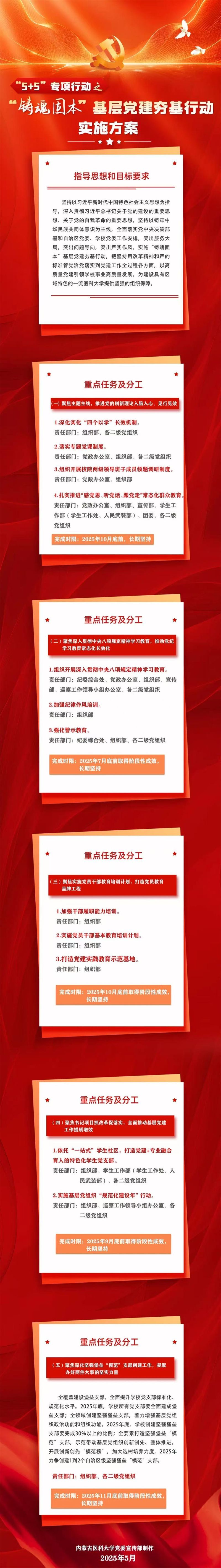 2025年是“十四五”规划收官之年,也是“十五五”规划布局之年,更是学校加快推进具有区域特色一流医科大学建设的关键之年。站在新的历史坐标上,学校坚持以习近平新时代中国特色社会主义思想为指导,全面贯彻党的教育方针,全面落实全国、全区教育工作会议精神,加强党对学校的全面领导,落实立德树人根本任务,以铸牢中华民族共同体意识为工作主线,推进教育、科技、人才融合发展,以“开局就是决战、起步就是冲刺”的状态,深入实施“5+5”专项行动。学校官媒将以专栏形式深度解读“5+5”专项行动实施方案,通过亮目标、明路径、晒举措,吹响高质量发展冲锋号,激励全体师生以思想之光照亮奋进之路,以理念之新催生发展动能之变,共同书写内蒙古医科大学高质量发展新篇章。