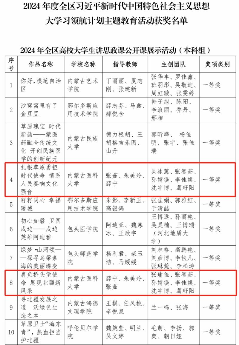 近日,内蒙古自治区高校思想政治理论课教学指导委员会公布了《2024年度全区习近平新时代中国特色社会主义思想大学习领航计划主题教育活动获奖名单》,我校师生获一等奖3项、二等奖1项。