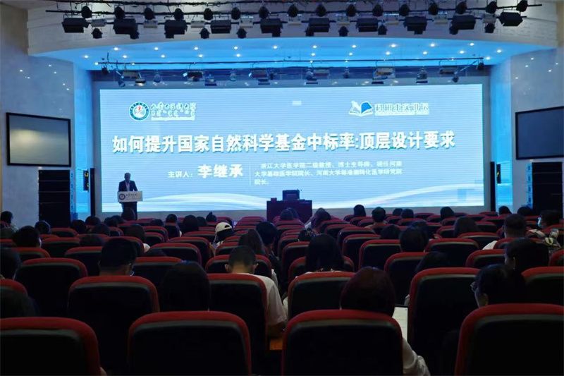 6月9日下午,浙江大学医学院二级教授、河南大学基础医学院院长,著名细胞生物学、组织胚胎学专家李继承教授做客我校“科研求实讲坛”,以“如何提升国家自然科学基金项目中标率:顶层设计要求”为题,结合自己近三十年申报及辅助申报国家自然科学基金项目的体会,围绕基金项目申报的立足点、如何进行选题、如何做好顶层设计,深入浅出地分享了宝贵经验。学校党委副书记、校长张晨及各学院、教辅单位、附属医院相关负责人、师生代表共200余人聆听了讲座。讲座由张晨校长主持。