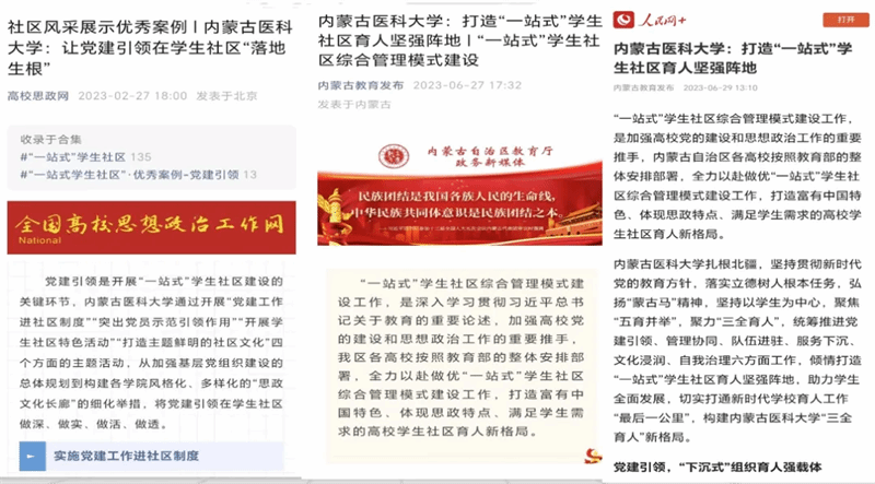 深化党建与业务“双融双促”,积极牵头建设学校“一站式”学生社区,以党建引领打造育人新阵地。在学生社区设立党员示范岗,近三年累计创建“党员示范寝室”150余间,评选星级文明寝室1800余间。支部党员深入一线,通过开展“亮出党员身份”“党员寝室挂牌”“我是党员我帮你”等党员示范岗系列活动,引导师生党员做到“一名党员就是一面旗帜”。推进学生公寓网格化管理,形成齐抓共管,广大学生共同参与的“楼委会—楼长—层长—宿舍长”四级网格化管理模式,构筑起“横到边、纵到底、全覆盖”学生思政教育机制。学校先后获批教育部“一站式”学生社区综合管理模式建设自主试点单位、自治区“一站式”学生社区综合管理创新基地、全国高校示范“一站式”学生社区。《让党建引领在学生社区落地生根》入选全国高校“一站式”学生社区风采展示活动优秀案例。先后接待130余所自治区内外高校来校观摩学习,相关经验被“人民网”“高校思政网”“内蒙古教育发布”等主流媒体报道。