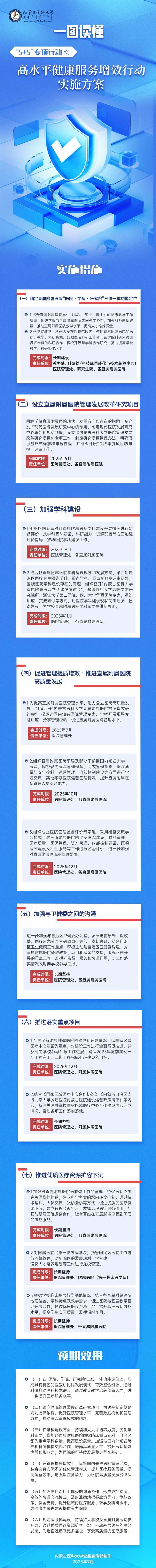 2025年是“十四五”规划收官之年,也是“十五五”规划布局之年,更是学校加快推进具有区域特色一流医科大学建设的关键之年。站在新的历史坐标上,学校坚持以习近平新时代中国特色社会主义思想为指导,全面贯彻党的教育方针,全面落实全国、全区教育工作会议精神,加强党对学校的全面领导,落实立德树人根本任务,以铸牢中华民族共同体意识为工作主线,推进教育、科技、人才融合发展,以“开局就是决战、起步就是冲刺”的状态,深入实施“5+5”专项行动。学校官媒将以专栏形式深度解读“5+5”专项行动实施方案,通过亮目标、明路径、晒举措,吹响高质量发展冲锋号,激励全体师生以思想之光照亮奋进之路,以理念之新催生发展动能之变,共同书写内蒙古医科大学高质量发展新篇章。