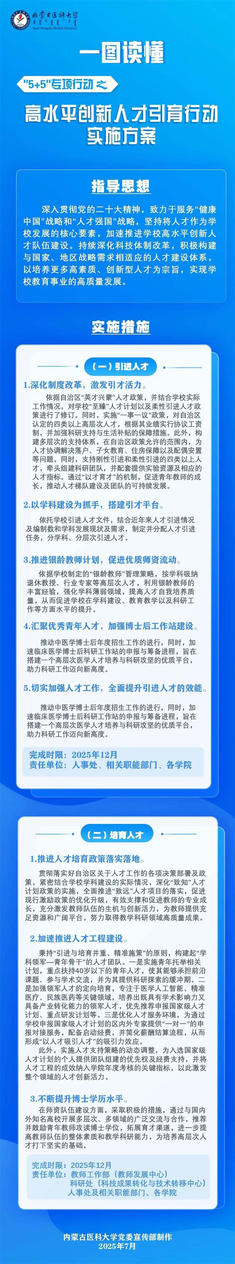2025年是“十四五”规划收官之年,也是“十五五”规划布局之年,更是学校加快推进具有区域特色一流医科大学建设的关键之年。站在新的历史坐标上,学校坚持以习近平新时代中国特色社会主义思想为指导,全面贯彻党的教育方针,全面落实全国、全区教育工作会议精神,加强党对学校的全面领导,落实立德树人根本任务,以铸牢中华民族共同体意识为工作主线,推进教育、科技、人才融合发展,以“开局就是决战、起步就是冲刺”的状态,深入实施“5+5”专项行动。学校官媒将以专栏形式深度解读“5+5”专项行动实施方案,通过亮目标、明路径、晒举措,吹响高质量发展冲锋号,激励全体师生以思想之光照亮奋进之路,以理念之新催生发展动能之变,共同书写内蒙古医科大学高质量发展新篇章。