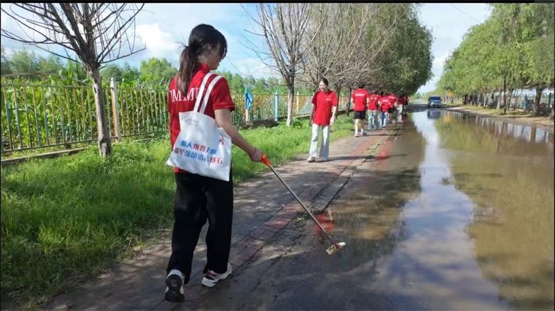 文化传承与生态实践同样亮点纷呈。我校“红心石榴籽”社会实践服务团队员走进蒙古族皮画工作室,制作“石榴花开”主题非遗作品,感悟北疆文化魅力;在内蒙古科尔沁国家级自然保护区自然教育中心,师生通过参观湿地展厅、实地考察,深化对生态文明的认知,并在双榆树嘎查开展垃圾分类宣传与环境清理,以实际行动践行绿色理念。此外,团队还参观了科右中旗历史文物展、民俗风情展等,深入了解当地历史文脉。