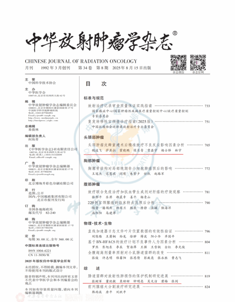近日,《中华放射肿瘤学杂志》第34卷第8期正式出版发行。我校附属医院放射肿瘤学教研室林宇老师团队指导的研究生魏凌飞撰写的论文《头颈肿瘤皮瓣重建术后精准放疗不良反应影响因素分析》,以及张剑老师团队指导的研究生张树军撰写的综述《肠道菌群对放射性肺损伤的保护机制研究进展》同时刊载于该期刊。