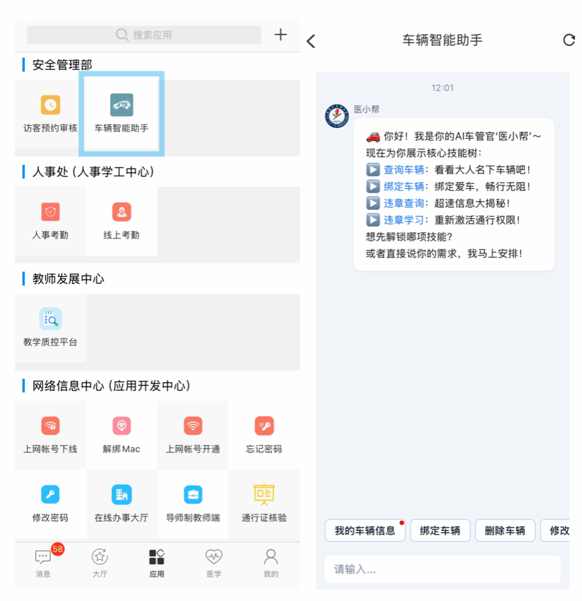 近日,学校网络信息中心与安全管理部依托学校“I医大”现有业务数据库与流程框架,开发智能服务平台——“车辆智能助手”。通过与AI智能体“医小帮”对话交互,实现教职工车辆管理、违章学习解控等业务的“一站式、智能化”管理,此举标志着我校智慧校园系统在服务能力上迈入功能完善、应用深化的新阶段。