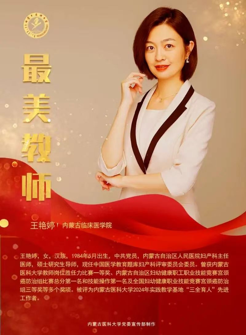 她注重因材施教,因课施教,针对不同授课内容、不同层次学生设计个性化教学方案,更力求以赛促学、以赛促教。2023年,她获得内蒙古医科大学教师岗位胜任力比赛一等奖。2024年,被评为内蒙古医科大学2024年实践教学基地“三全育人”先进工作者。