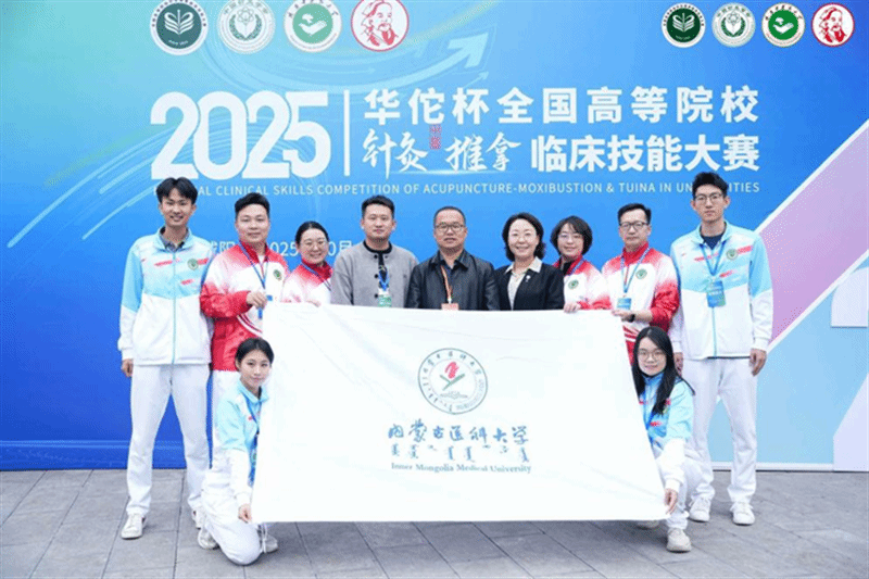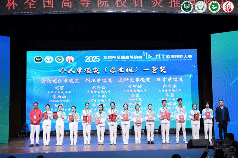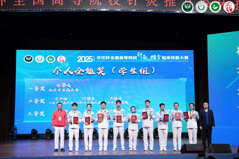 10月19日,为期两天的2025“华佗杯”全国高等院校针灸推拿临床技能大赛在陕西省咸阳市圆满落幕。我校由中医学院敖有光、王丹、王玉盛、张天瑜4名教师,杨宇、王雅婷、刘文墨谨、王勇淅4名学生组成的参赛队,凭借扎实的理论功底、娴熟的临床技能和稳定的竞技状态,在全国49所高等院校参赛队伍中脱颖而出。其中,学生组作为8所院校之一入围决赛。经过激烈角逐,我校师生参赛队获团体二等奖(全国第11名),杨宇同学获个人全能奖,王玉盛、杨宇、王雅婷3人获个人单项奖,5名师生获优秀奖。